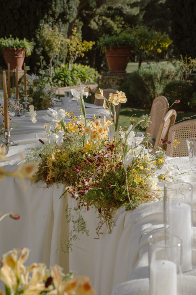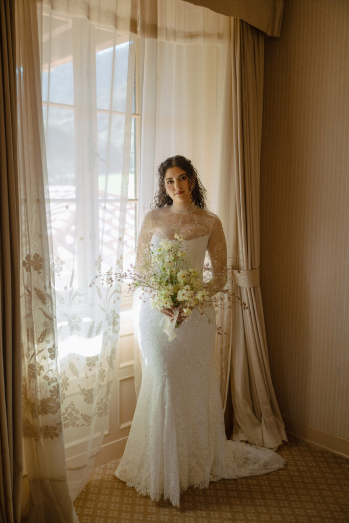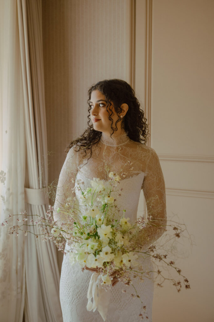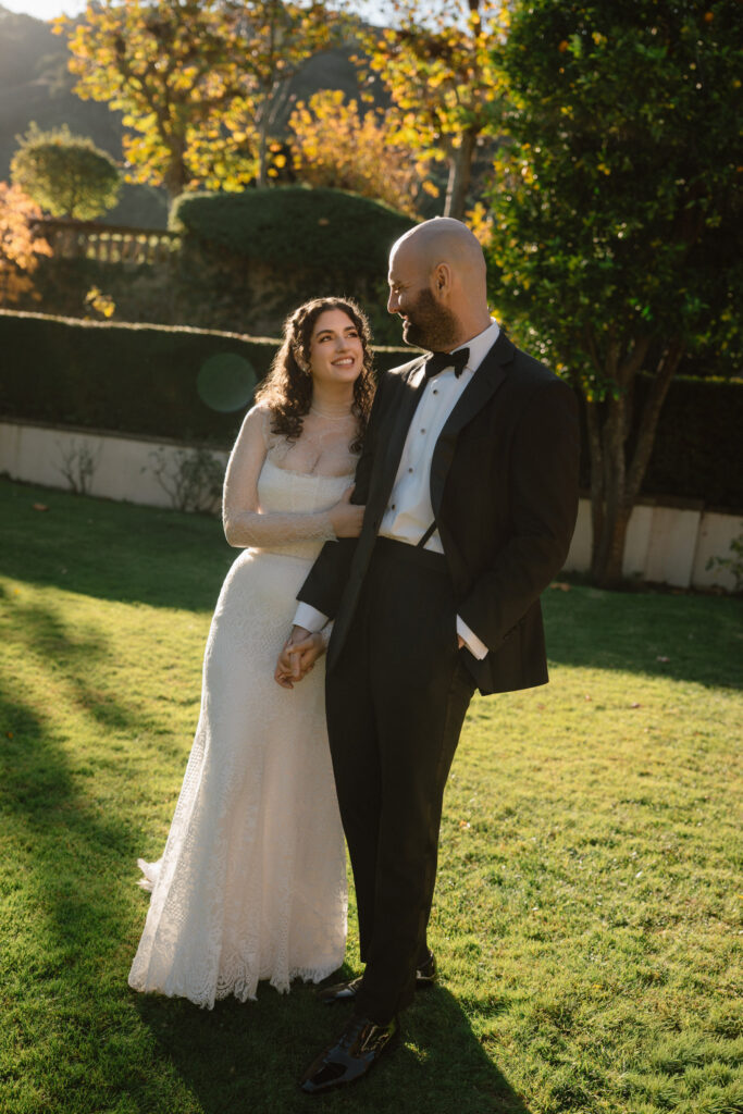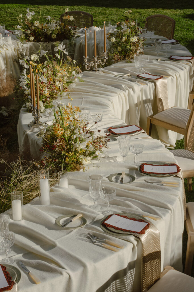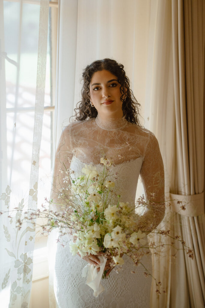 For this session, letting the couple move naturally through the estate felt right. Inside, the simple interiors and soft drapes provided the perfect setting for chic, timeless luxury wedding photography. Outside, each path and green space offered a new backdrop, allowing playful, intimate, and quiet moments, while giving flexibility for varied poses and natural movement. The curved table scape and whimsical florals added elegance and motion, while pops of fall color brought a natural warmth to the scene.